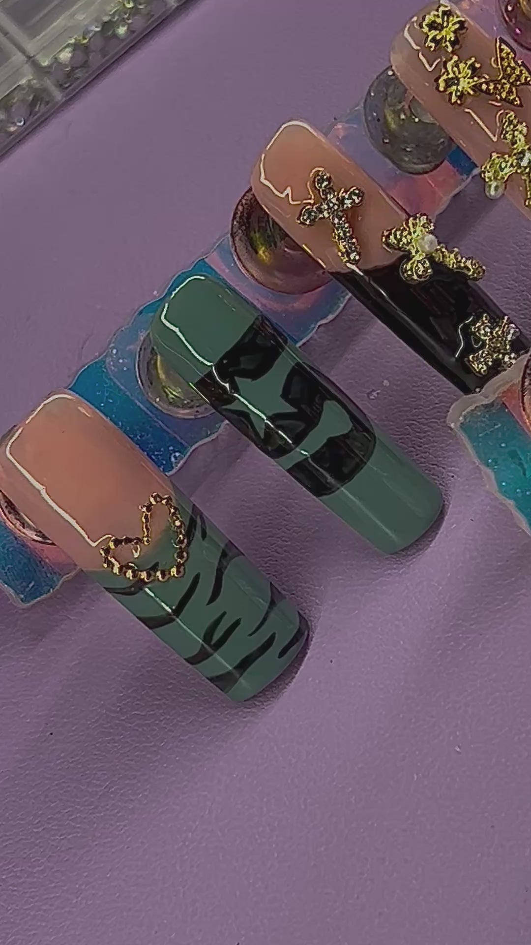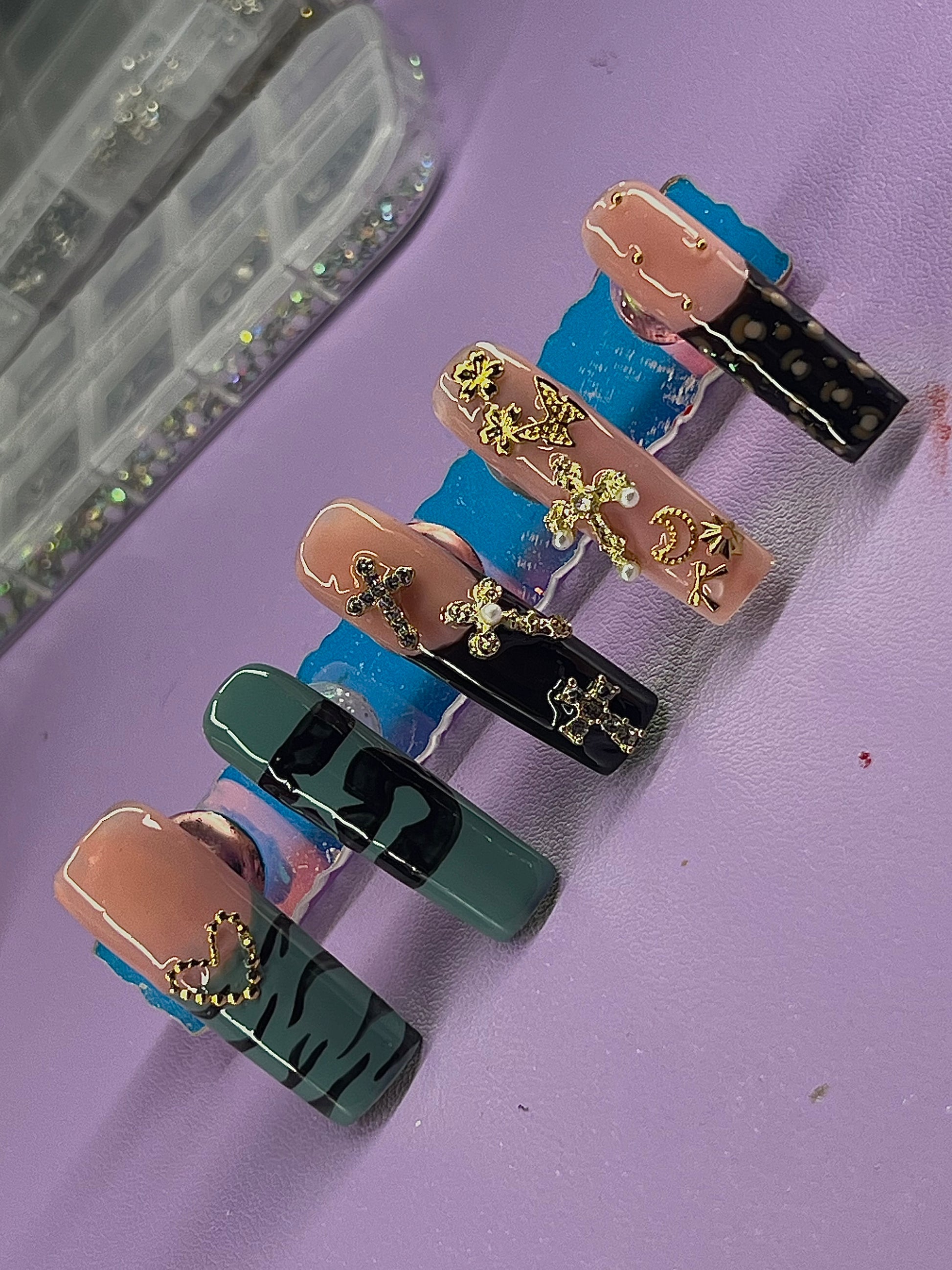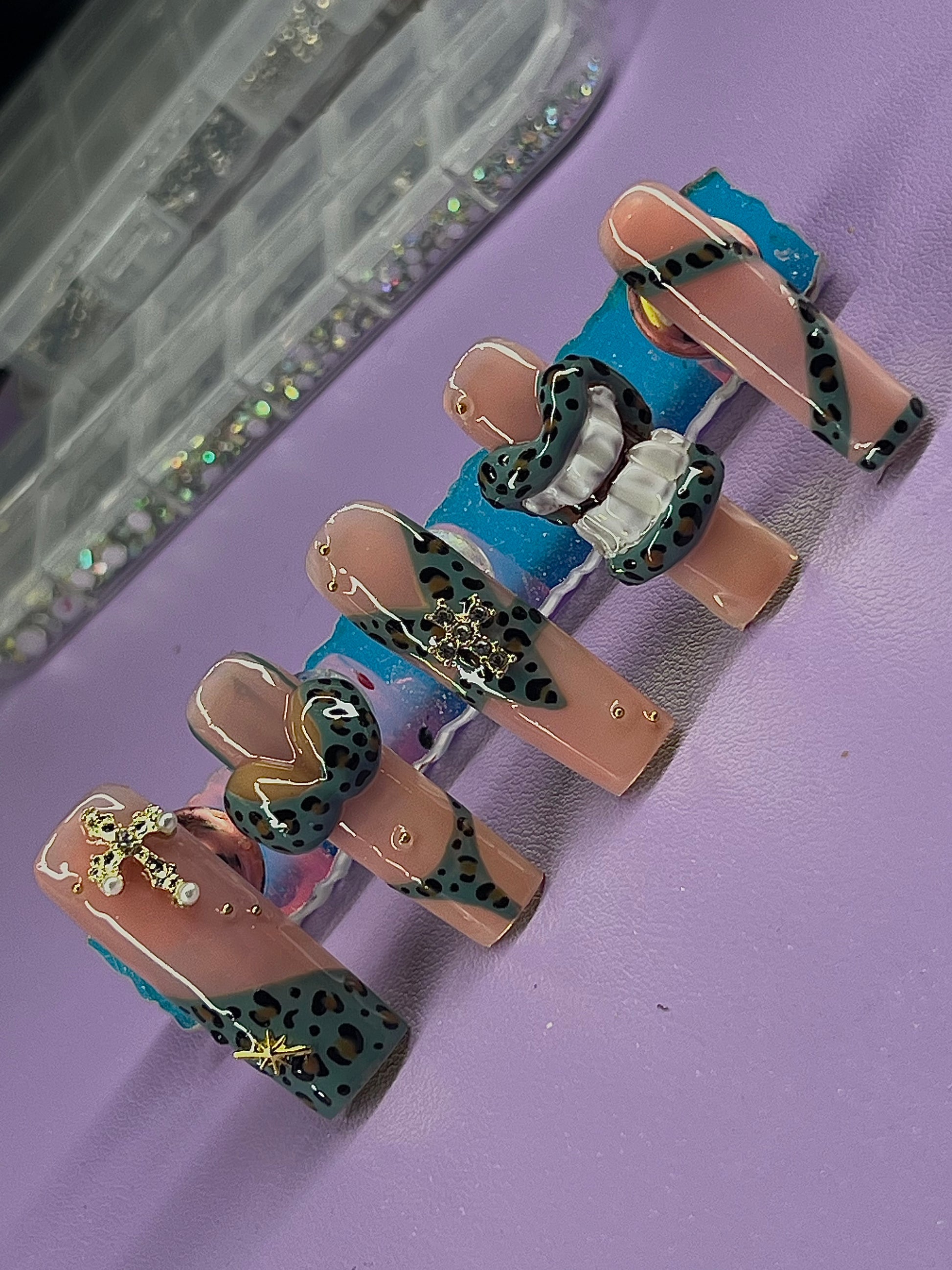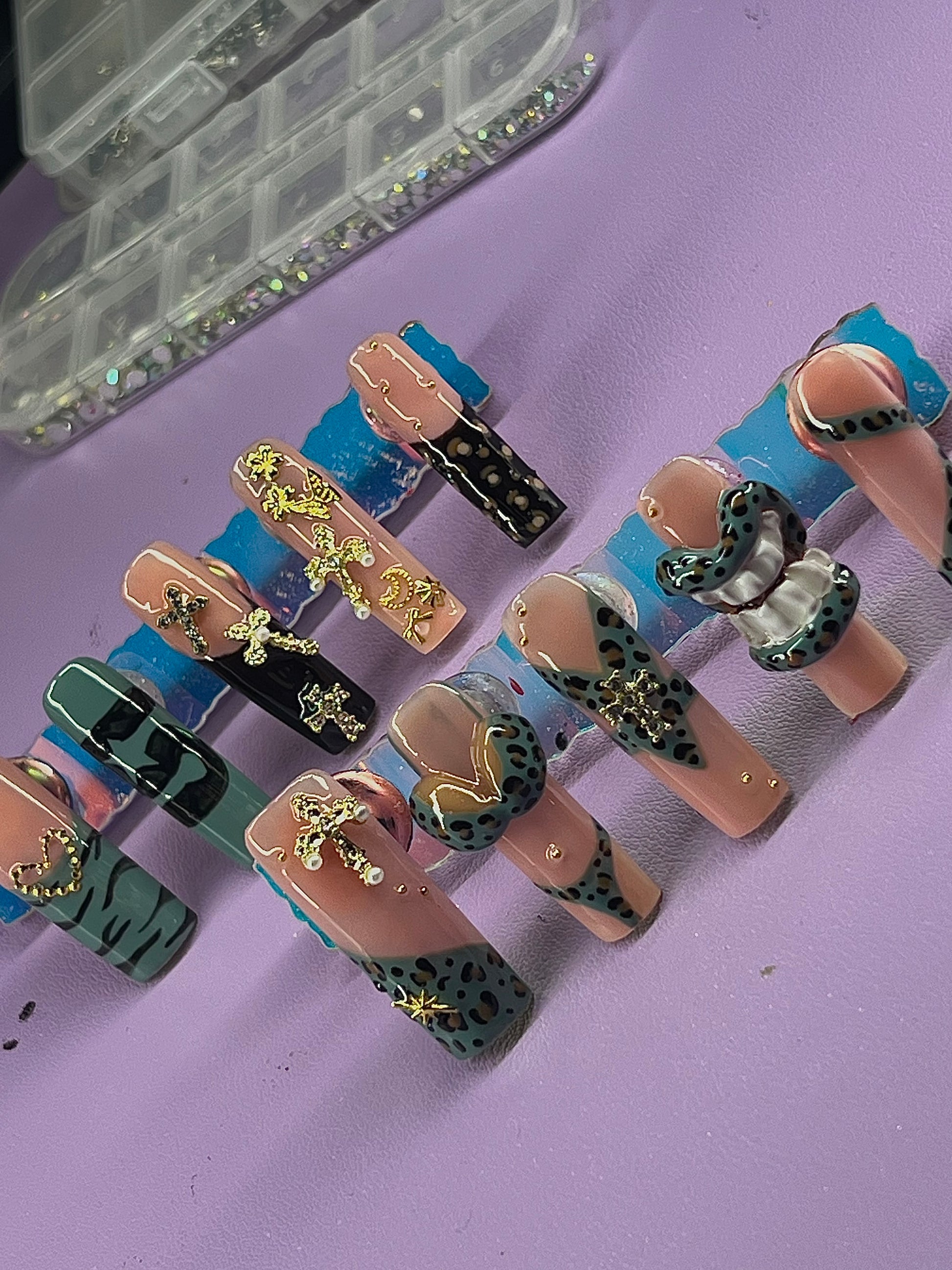 This is a Xlong set, with some 3d sculpting art and some cutesy charms and rhinestones. If you love cheetah print then you would absolutely love this set!